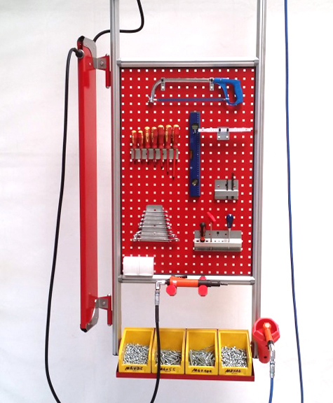 Die Ergonomie lässt ebenfalls keine Wünsche offen: Werkzeuge und Medien sind stets in ergonomischer Greifhöhe zur Stelle. Die Unfallgefahr wird minimiert, da kein Werkzeug oder Schläuche und Kabel auf dem Boden liegen. Durch das leichte Mitnehmen des Tableaus und somit verbunden die kurzen Laufwege, spart man außerdem Zeit und Kosten.